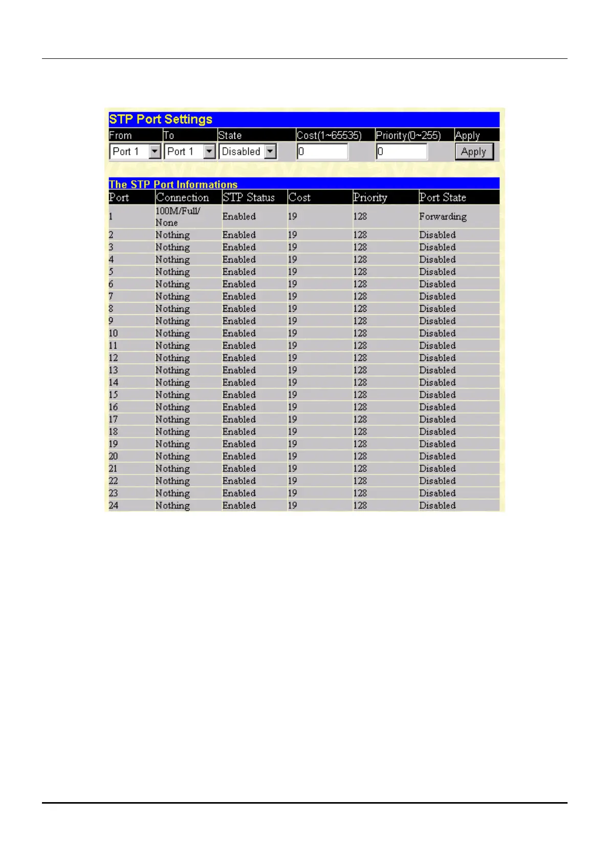 • Cost (1~65535) – A port cost can be set between 1 and 65535. The lower the cost, the greater