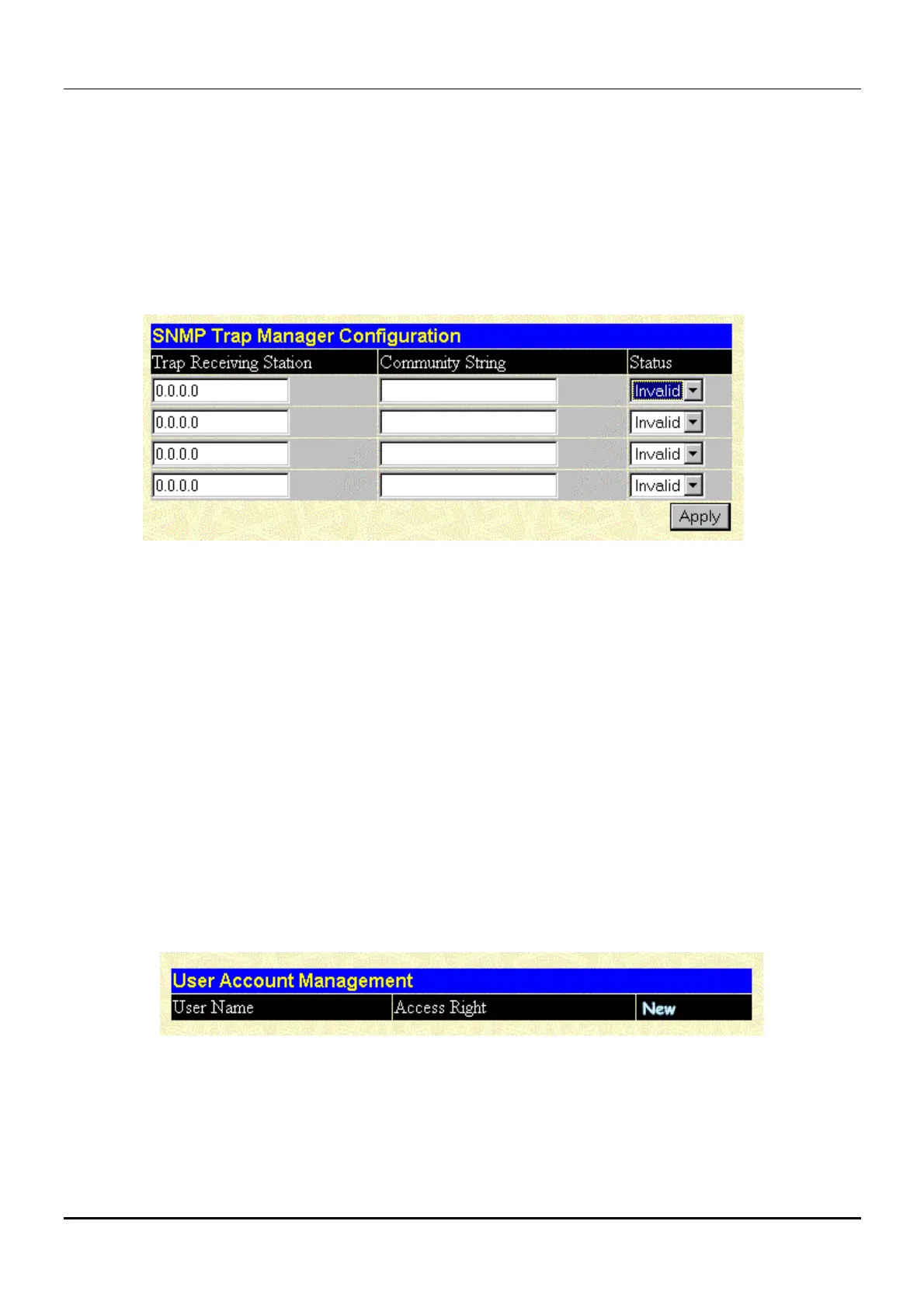 receive and store traps. You may enter up to four entries. Click Apply to put the settings into