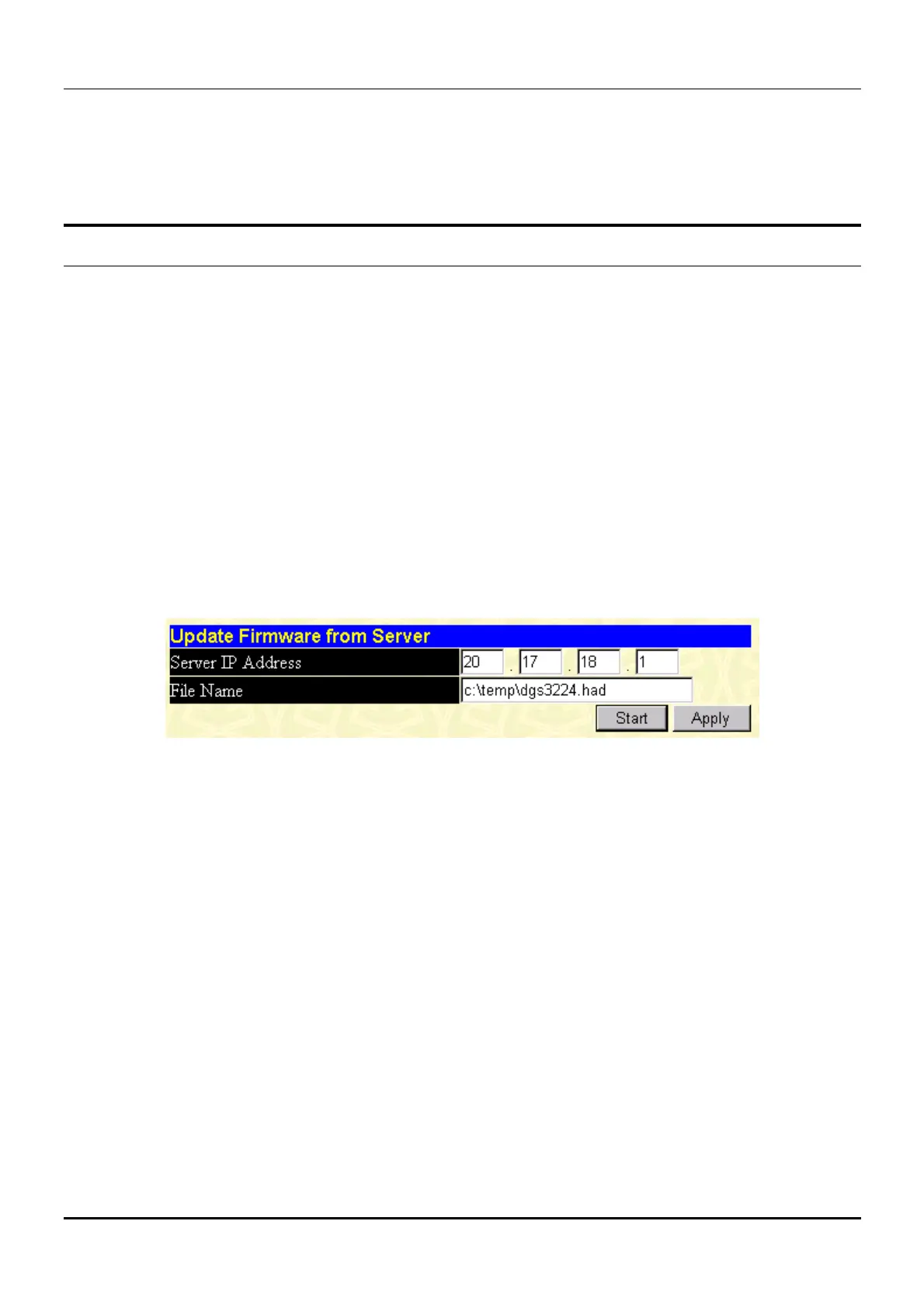 name of the firmware file for the switch. Click Apply to enter the server’s IP address into the switch’s