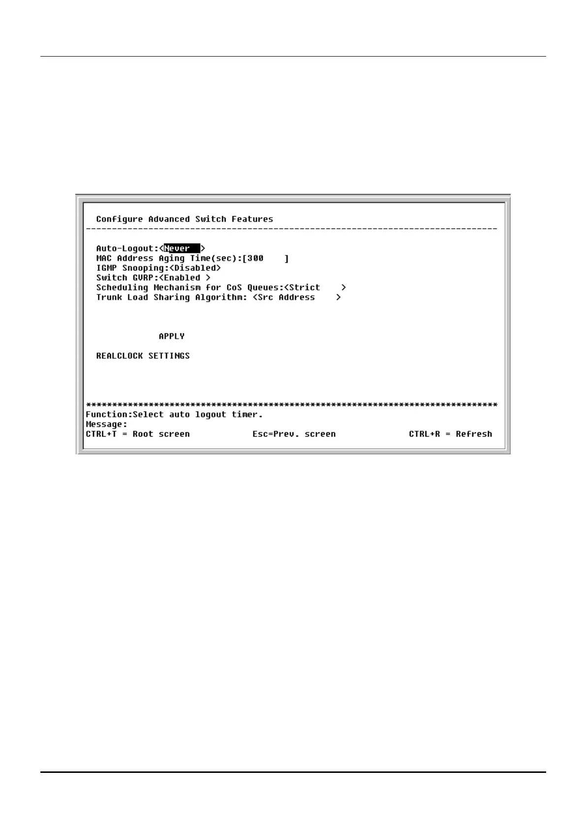• Auto-Logout:<Never> – This sets the time the interface can be idle before the switch automatically