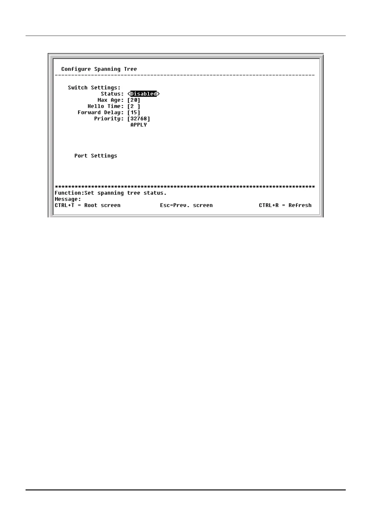 • Priority: [32768] – A Priority for the switch can be set from 0 to 65535. 0 is equal to the