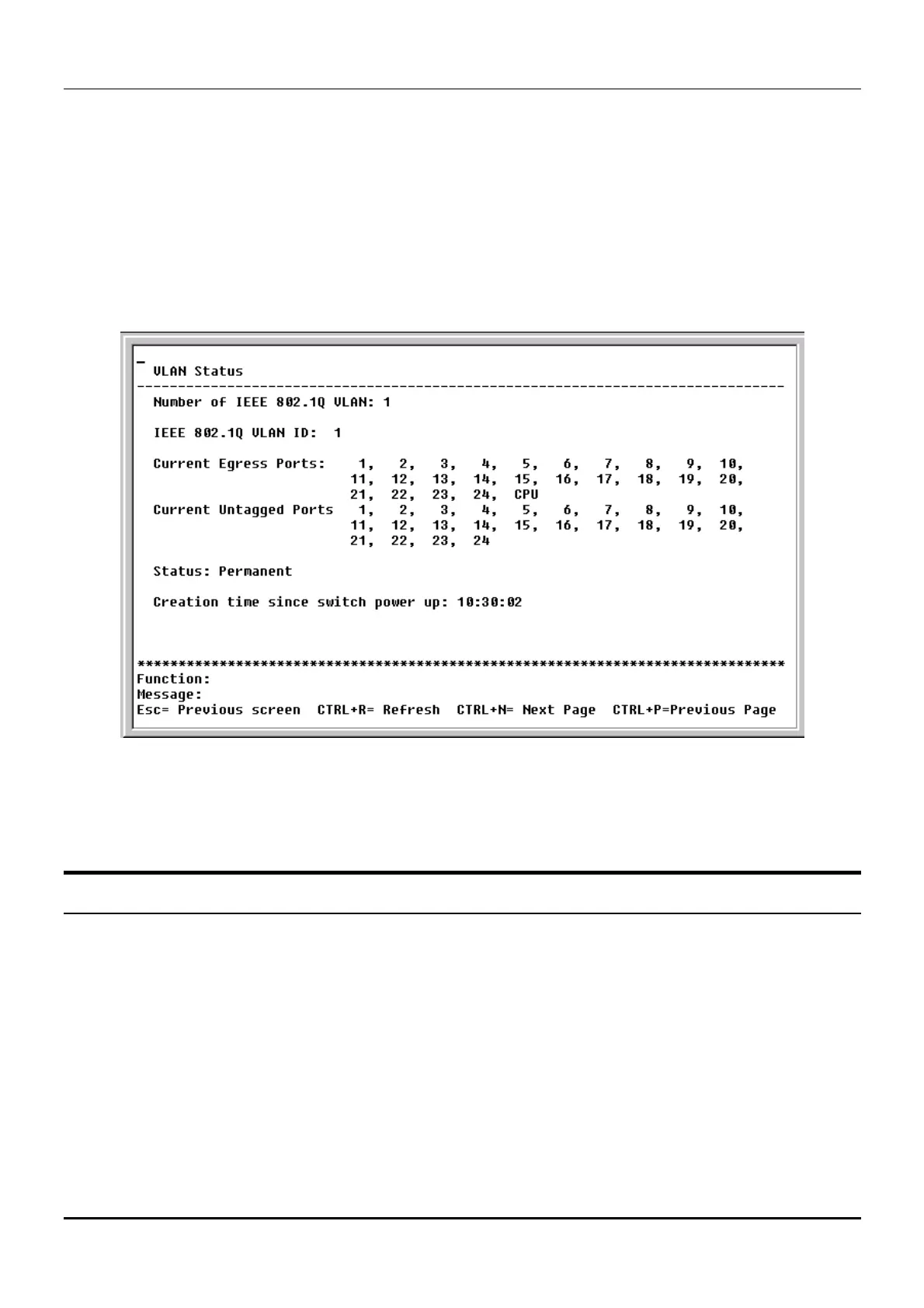 This read-only screen displays VLAN information. Press CTRL + N to see the VLAN on the next page or