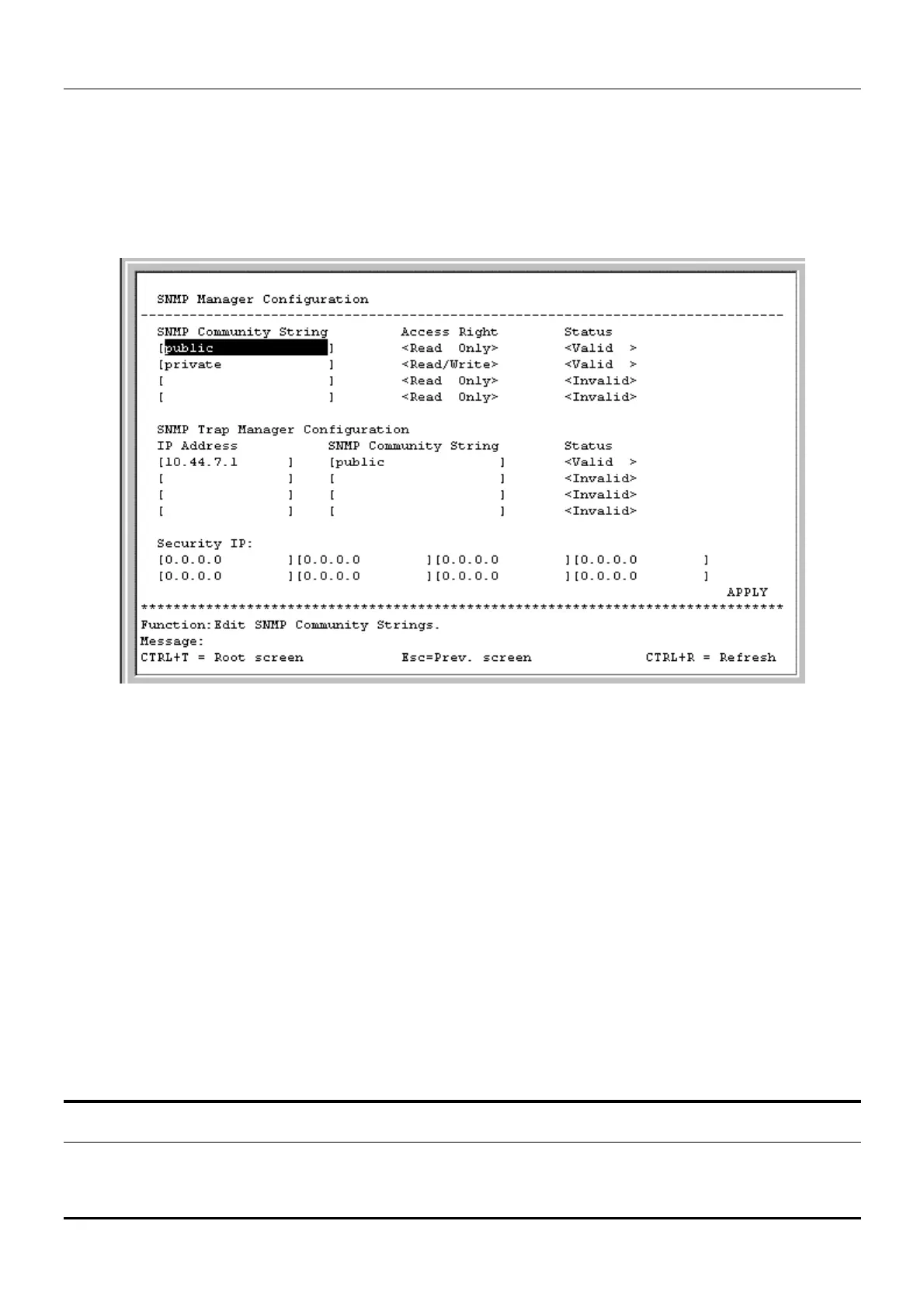 Choose SNMP Manager Configuration to access the third item on the main menu. The following screen