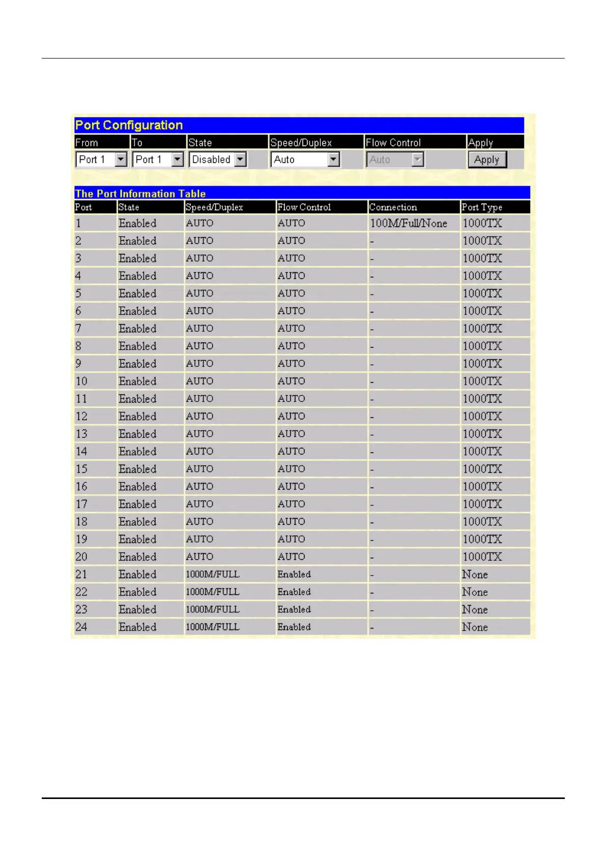 2. Configure the Speed/Duplex setting for the twenty 10/100/1000 ports. Select Auto to allow the