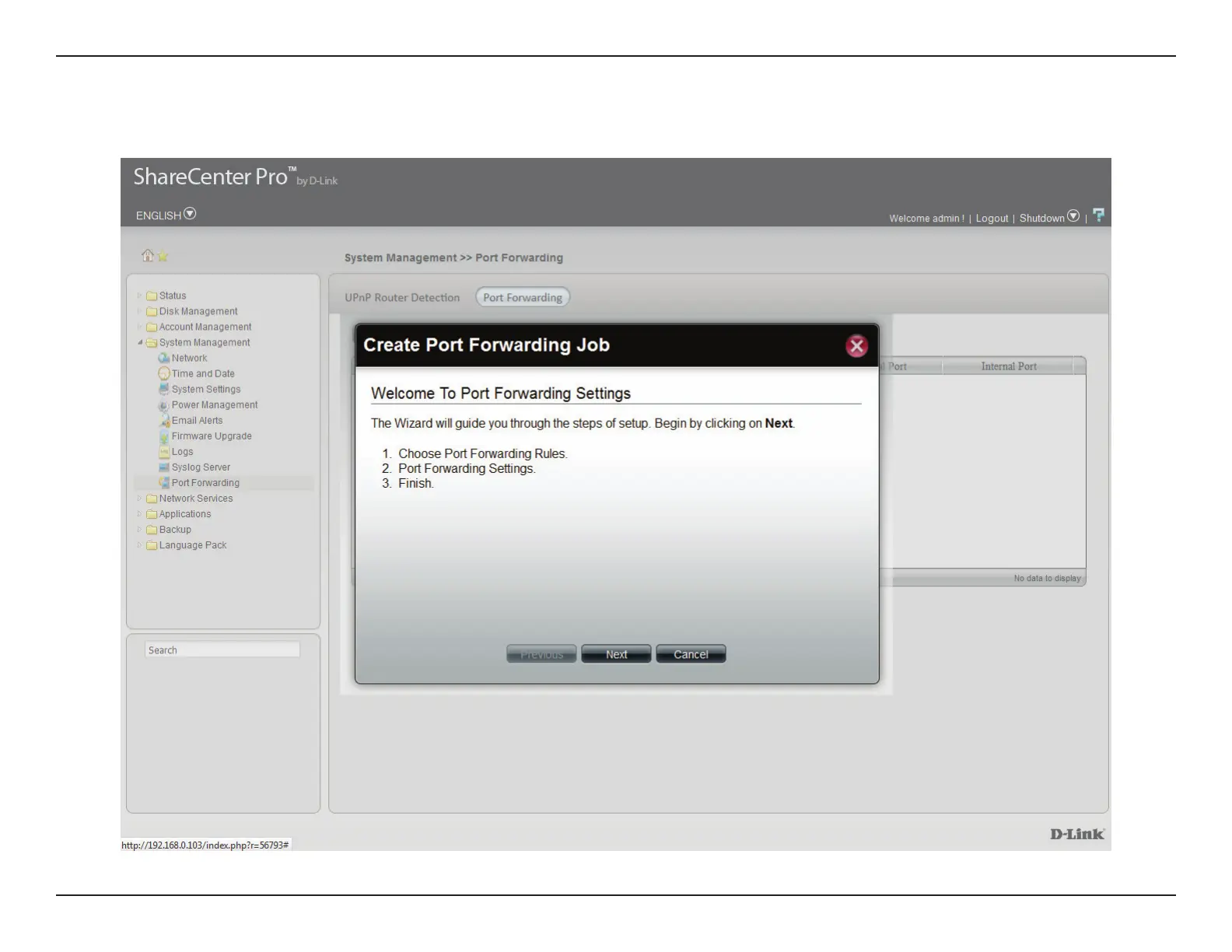 The Port Settings Wizard will guide you through the basic Port Forwarding setup. Read the instructions and click Next to