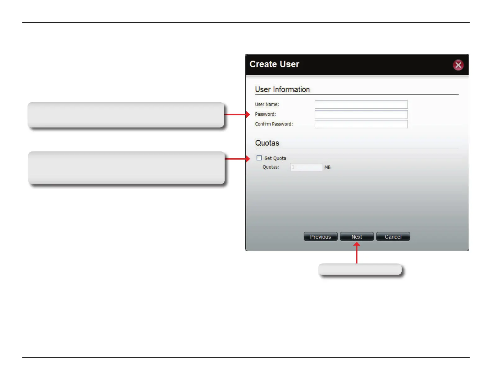 Quota check box and enter the storage quota in megabytes