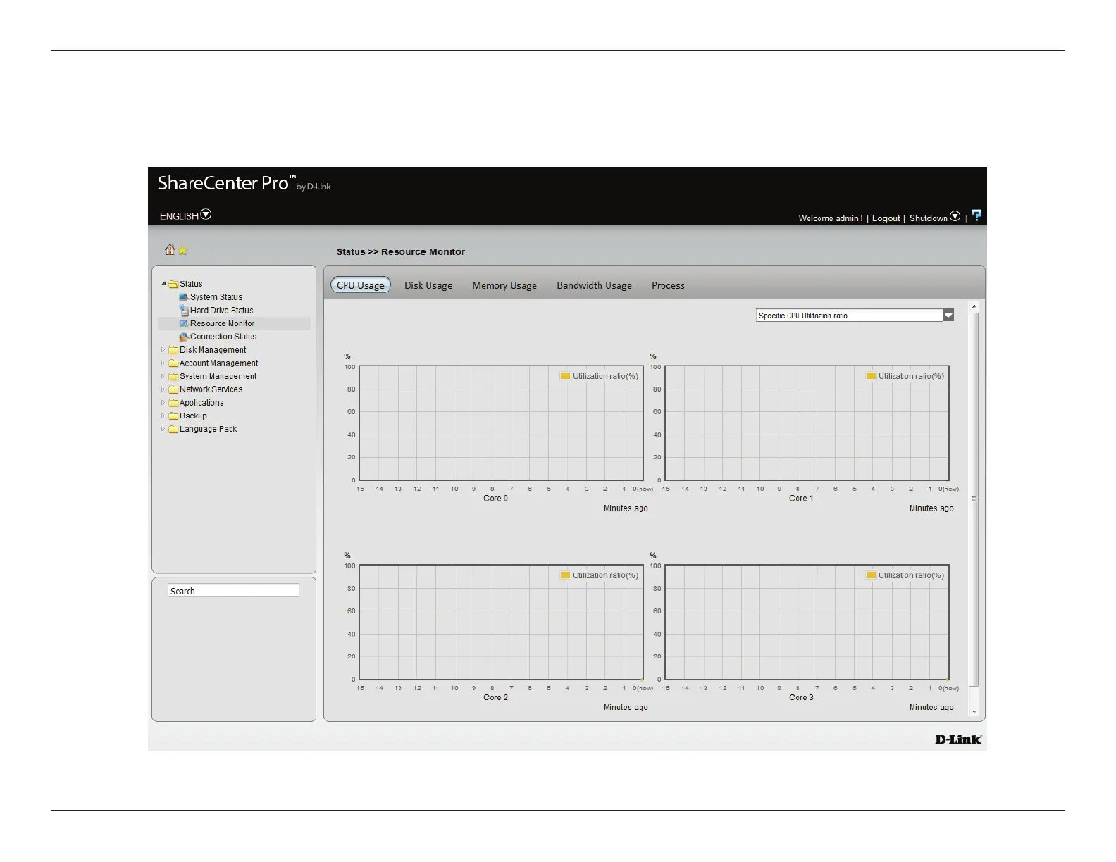 The Resource Monitor screen provides detailed information on CPU Usage, Disk Usage, Memory Usage, Bandwidth Usage and