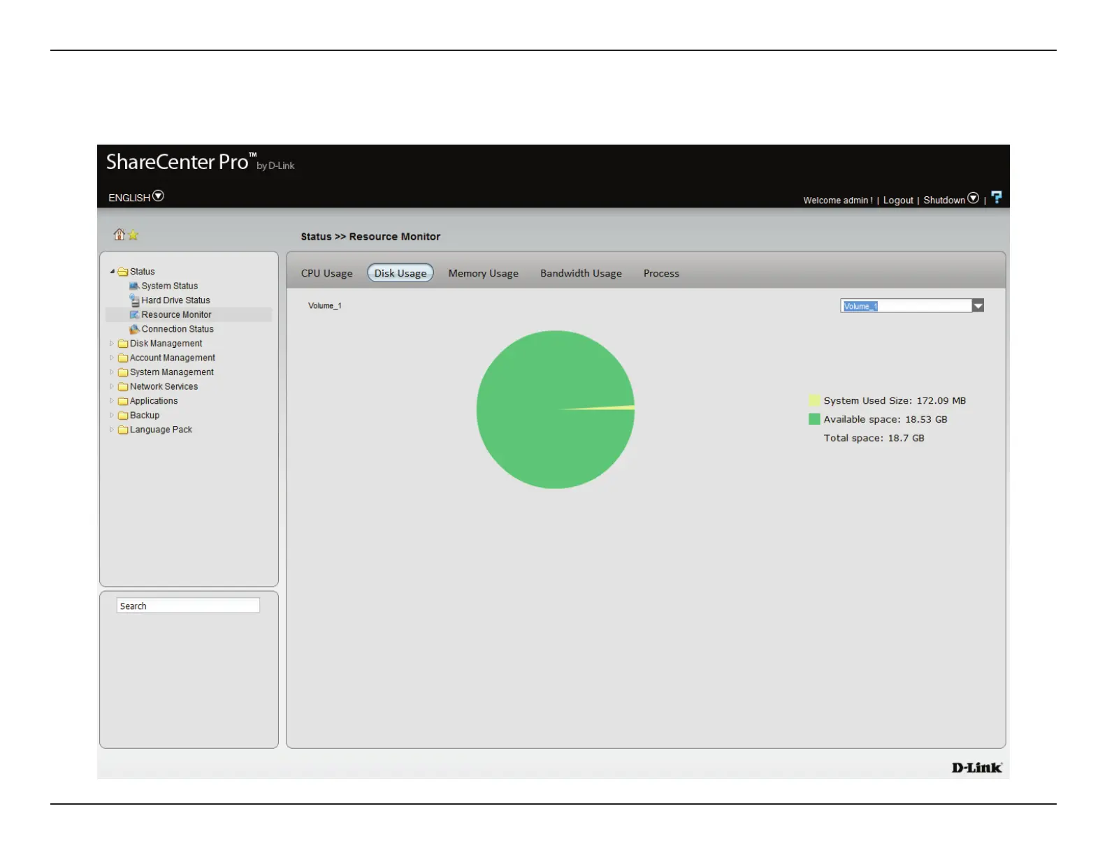Disk Usage depicts the System Used size, Available Disk Space, and the Total Disk Space .