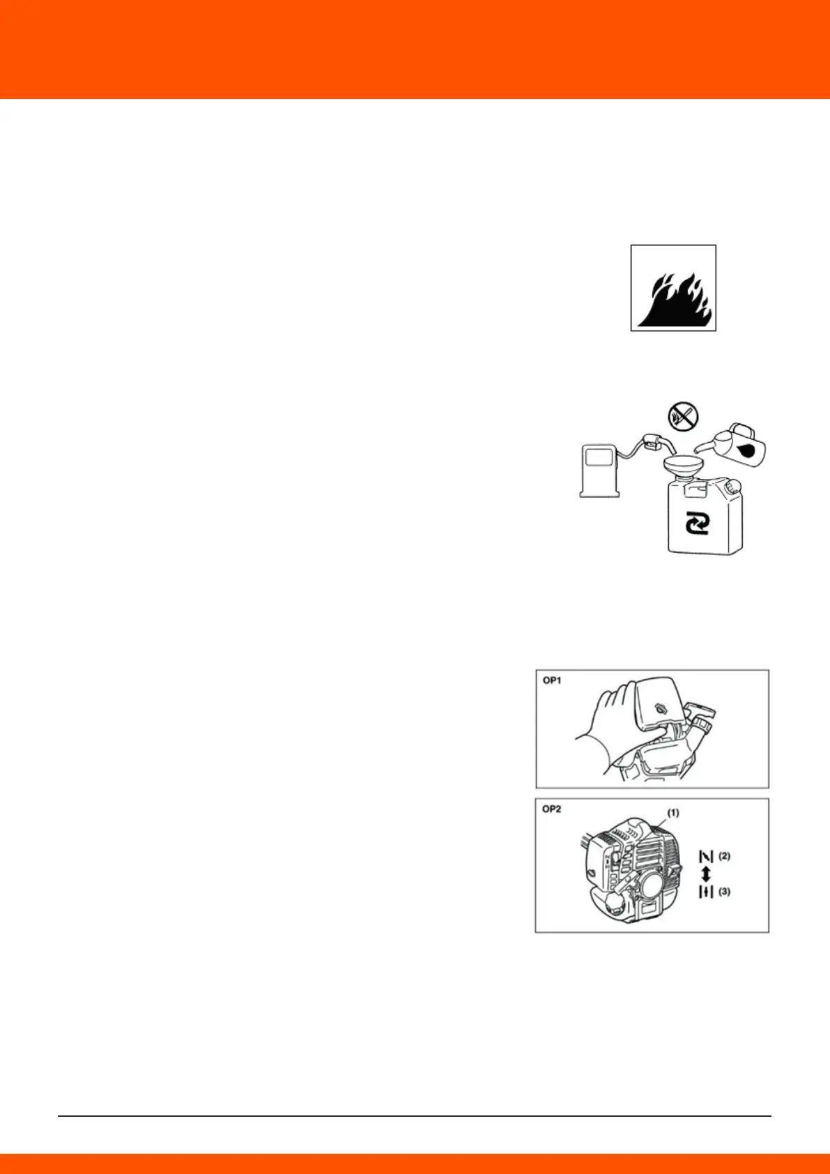 • Never touch the cylinder, muffler, or spark plugs with your bare hands immediately after stopping