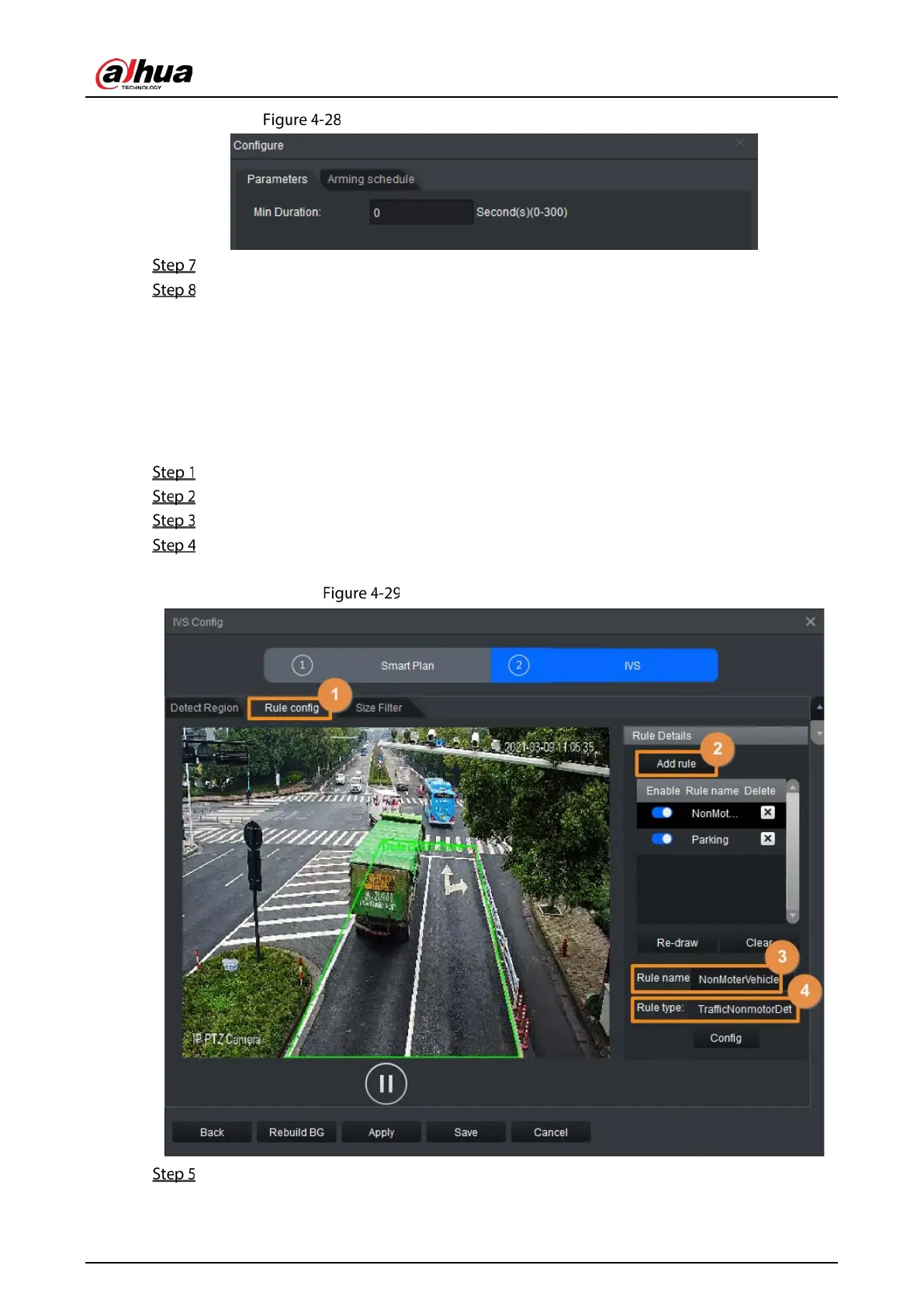 Configure arming schedule. See Step 7 in "4.3.5.1 Parking Detection".