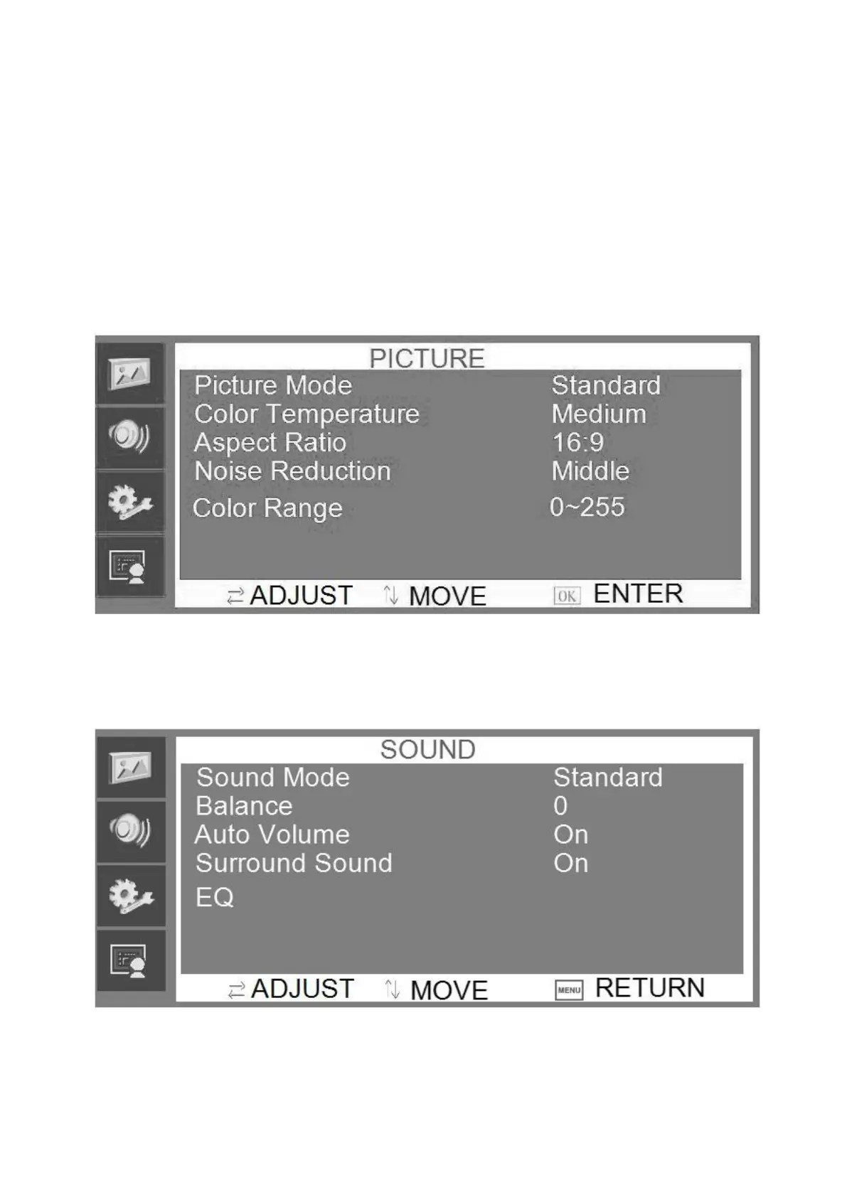 Press ▲▼ button to adjust value when item is selected, press menu button to exit.