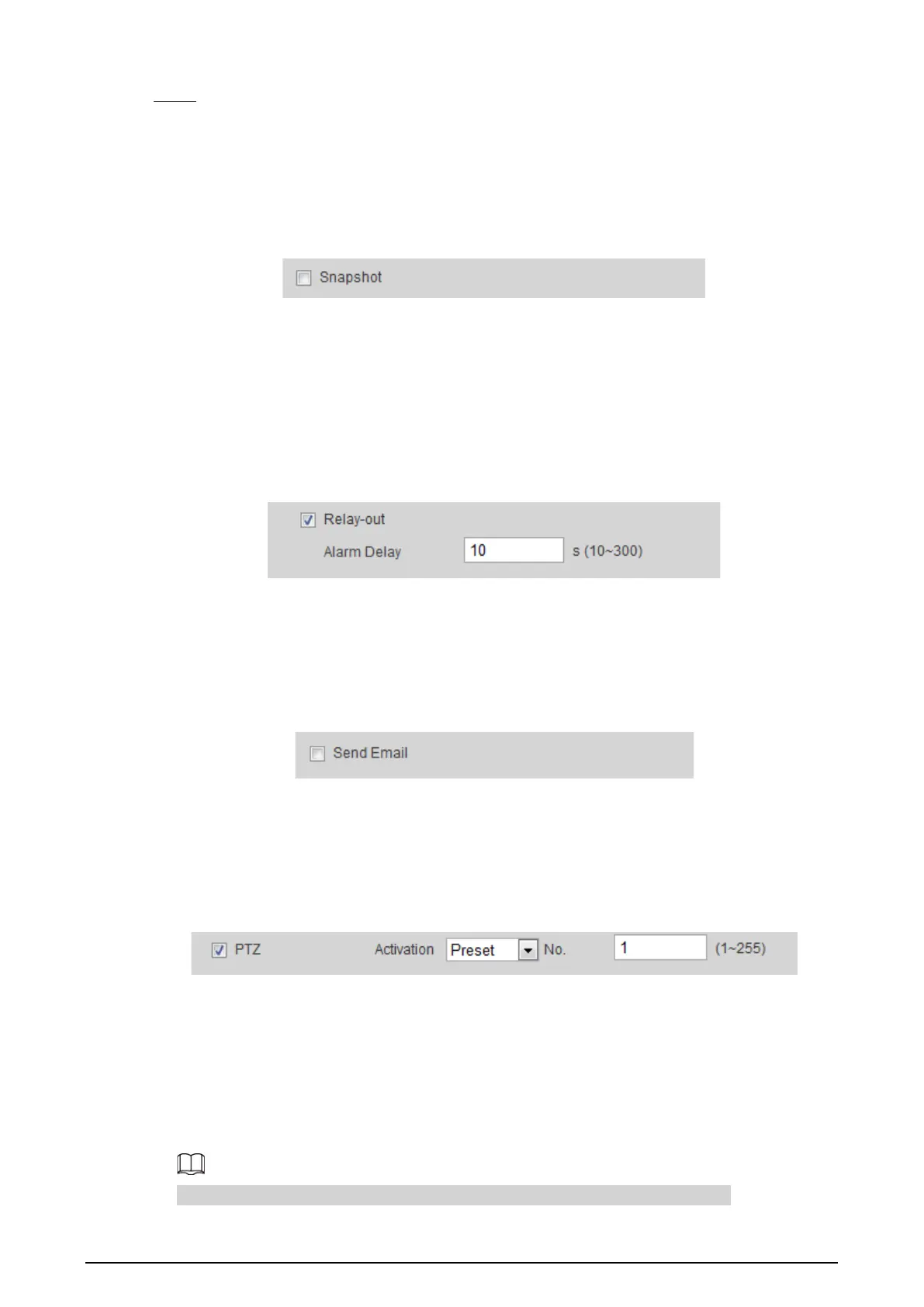 When an alarm is triggered, the system links PTZ to do some operations. For example, the system