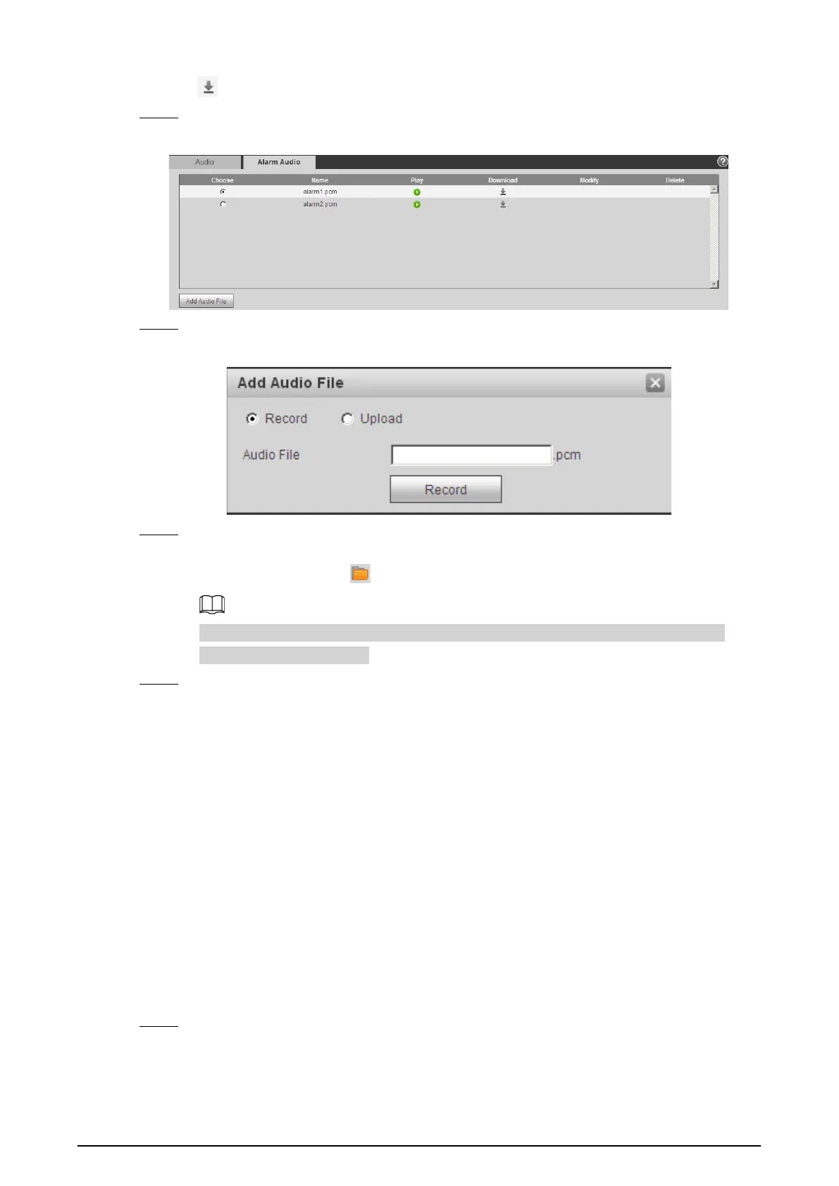 The camera supports audio file with .pcm format only, and you can upload audio files
