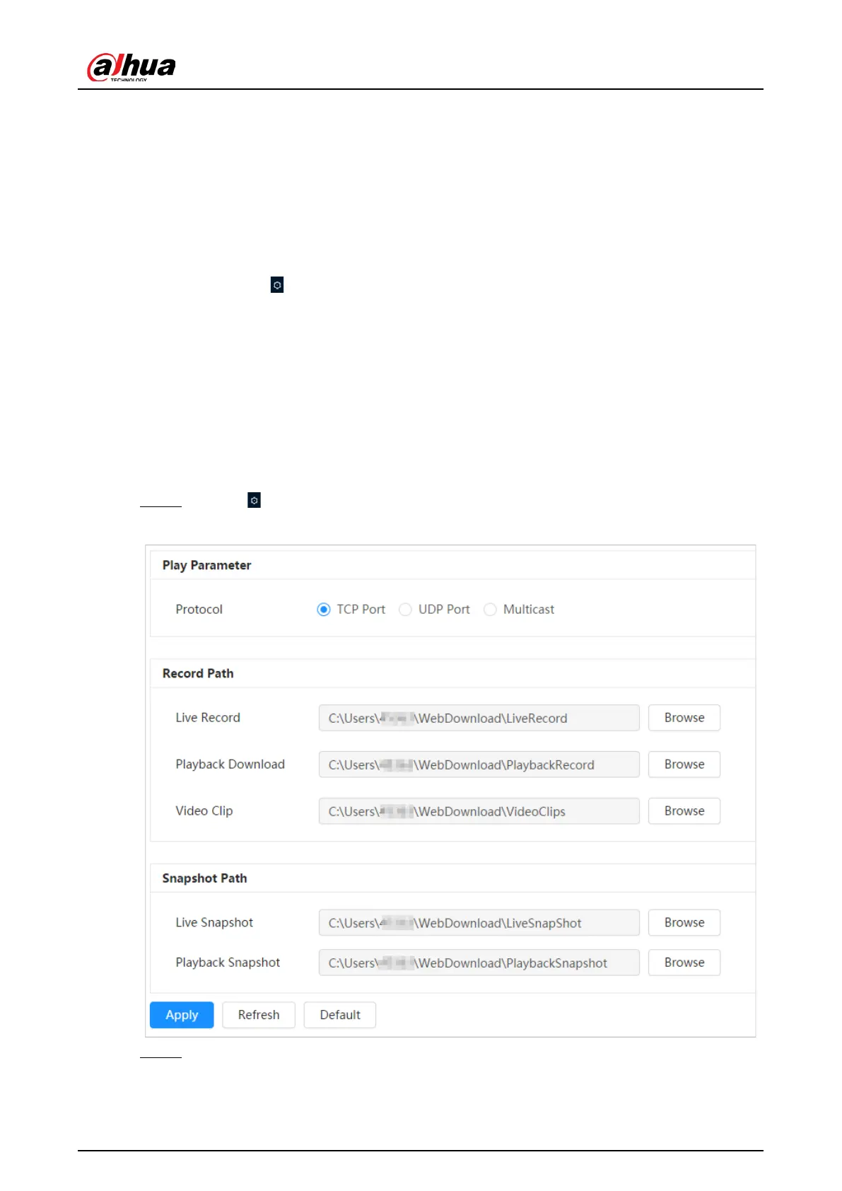 You can select protocol and configure the storage path for live snapshot, live record, playback
