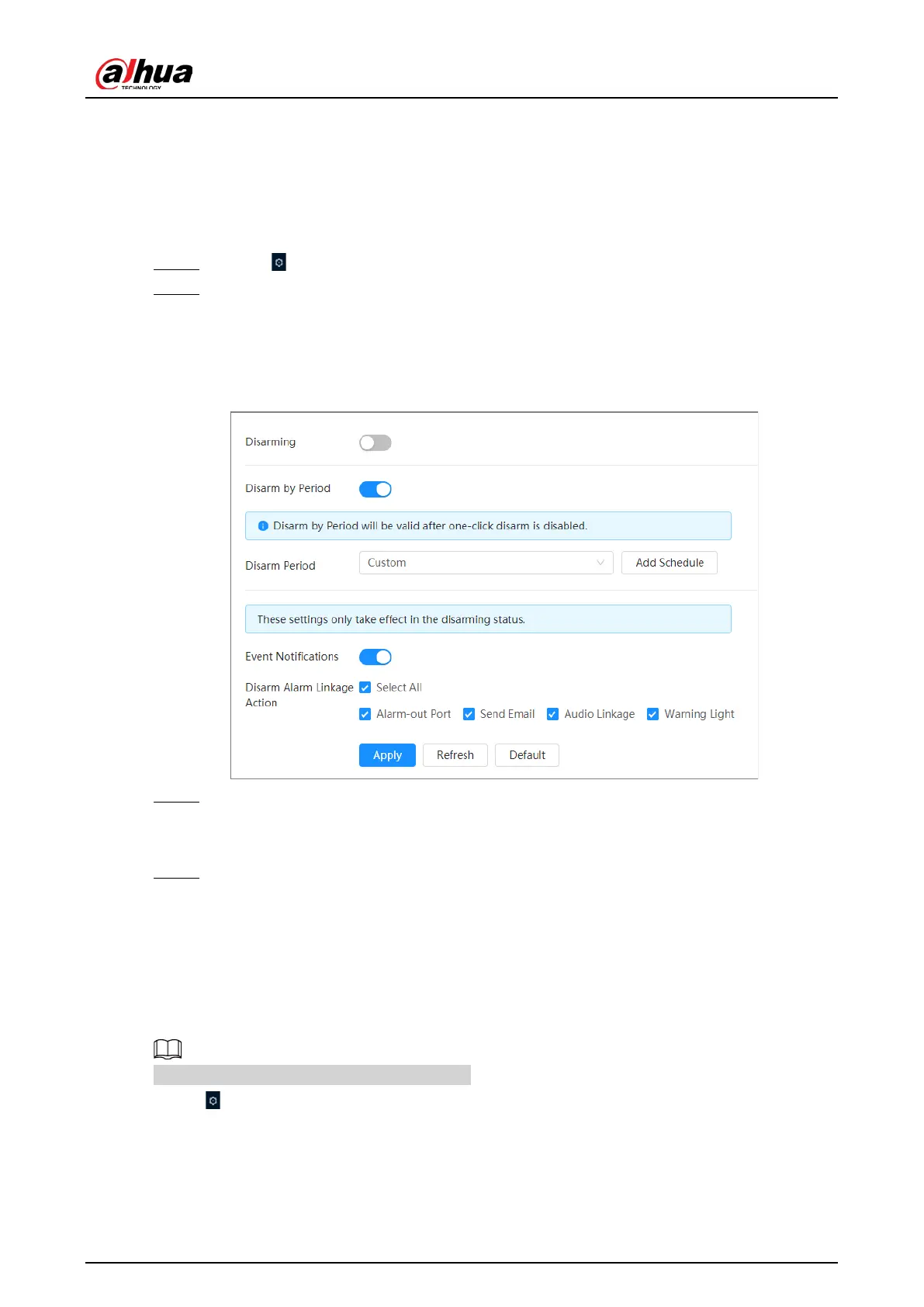 Disarm by Period: The system stops triggering alarm linkage actions in the
