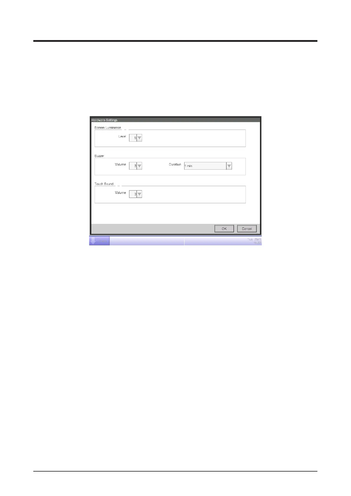 You can set up the hardware settings, such as the screen luminance and buzzer volume of the iTM