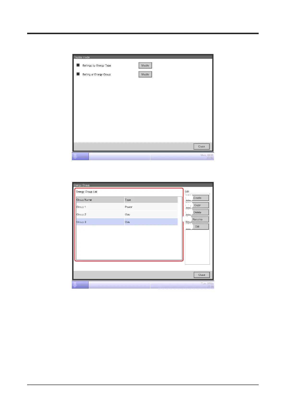 To set up energy groups, touch the Modify button (14) to display the Energy Group screen.