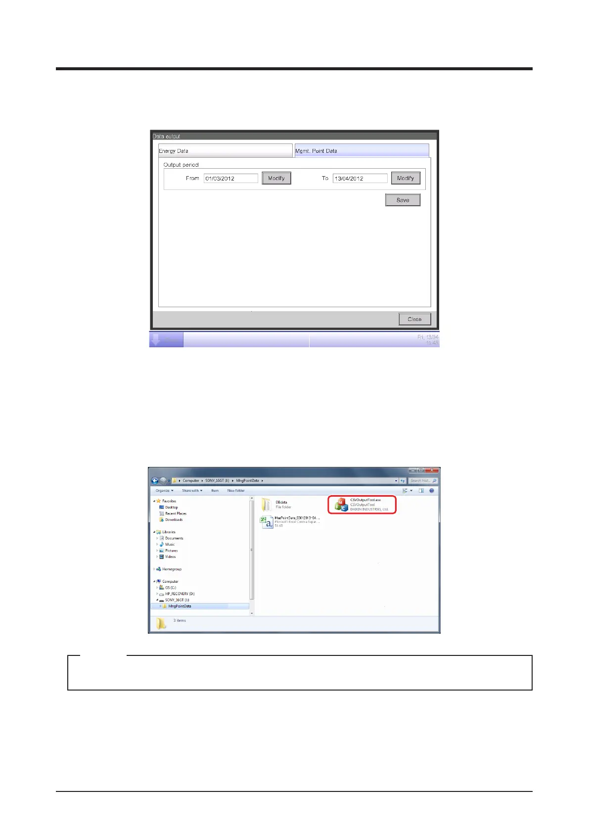 Open the folder saved in the USB memory and execute “CSV Output Tool” to create the CSV le.