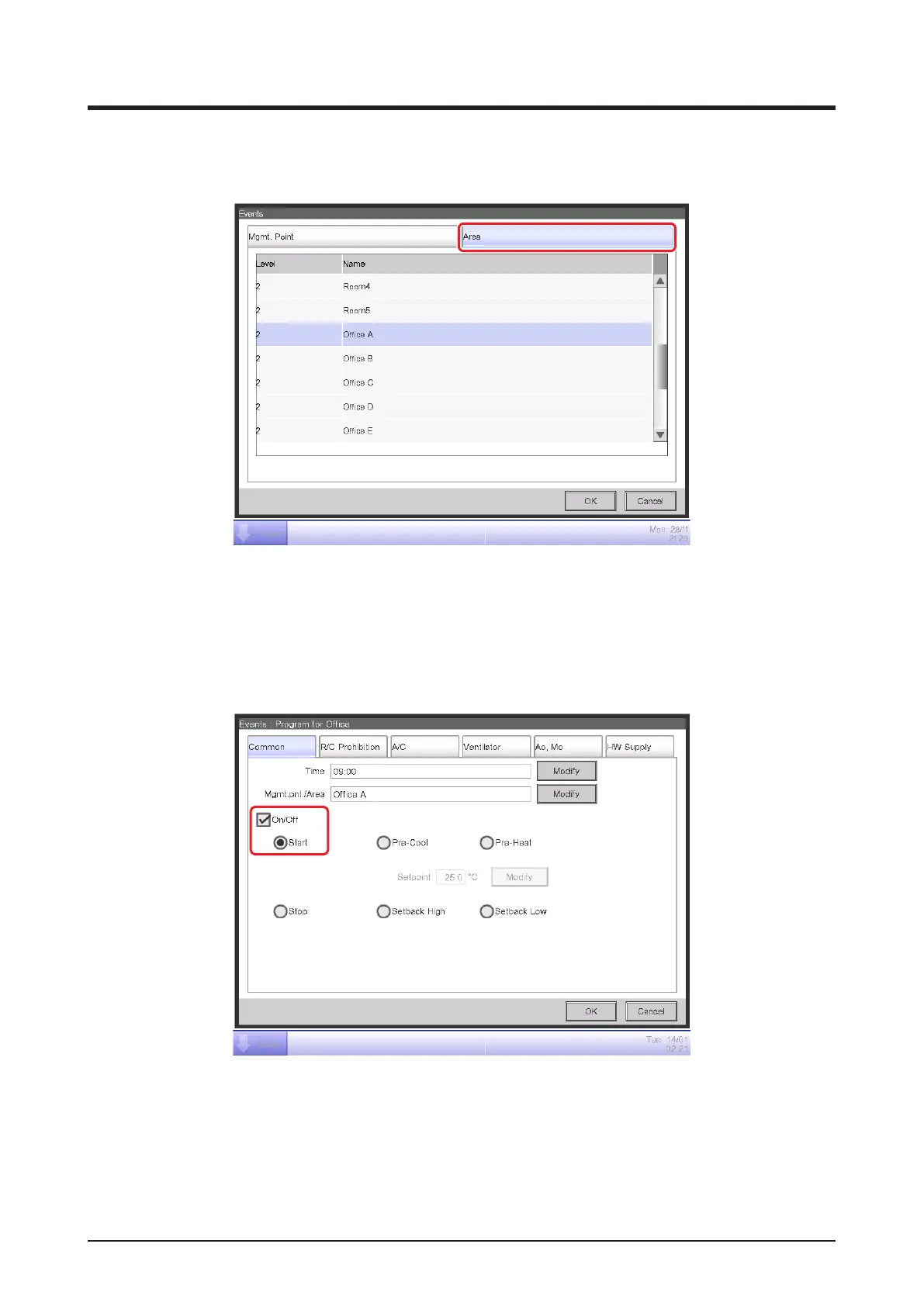 Touch and display the Area tab. Select “Office A” from the list, and touch the OK button to