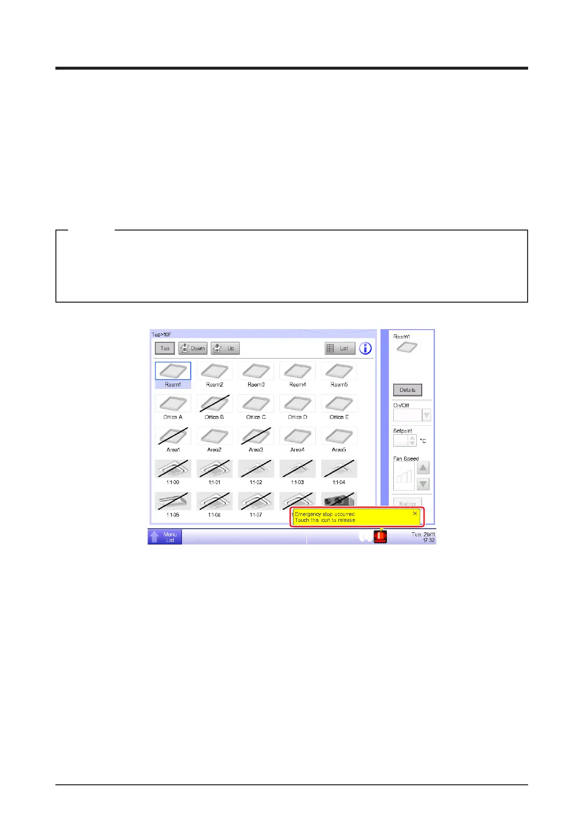 The following describes how to interpret the Emergency Stop view and release an emergency stop.