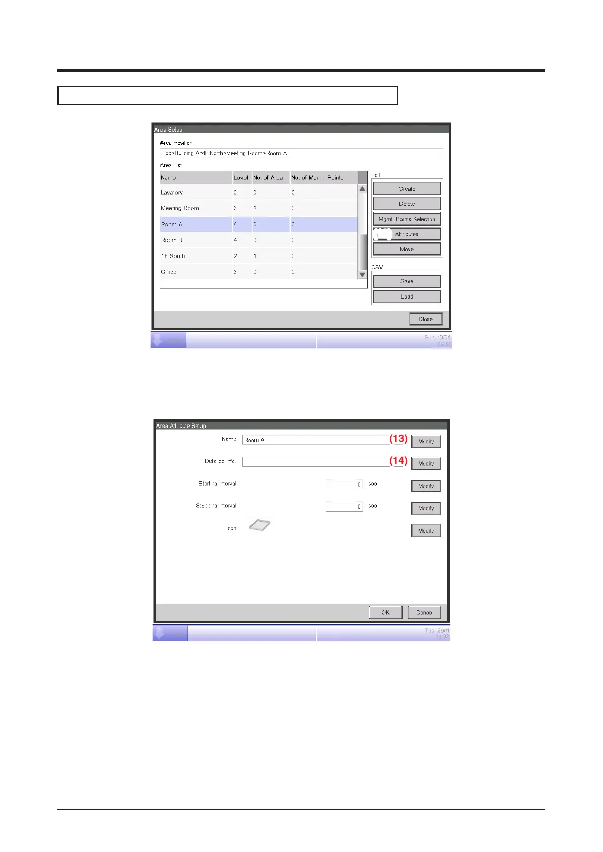 1. Select the area to name and set up the detailed information from the Area Setup screen and