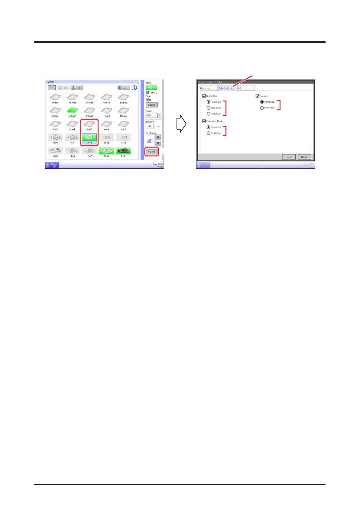 (For detailed operation, see “4-2 Detailed Setup Screen : R/C Prohibition Tab”.)