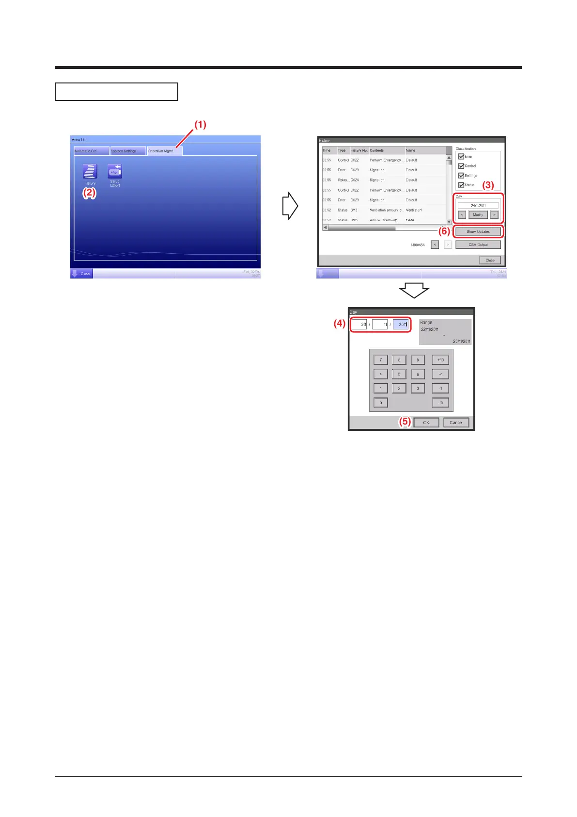 (For detailed operation, such as outputting to CSV, see “7-1 Checking and Outputting History”.)