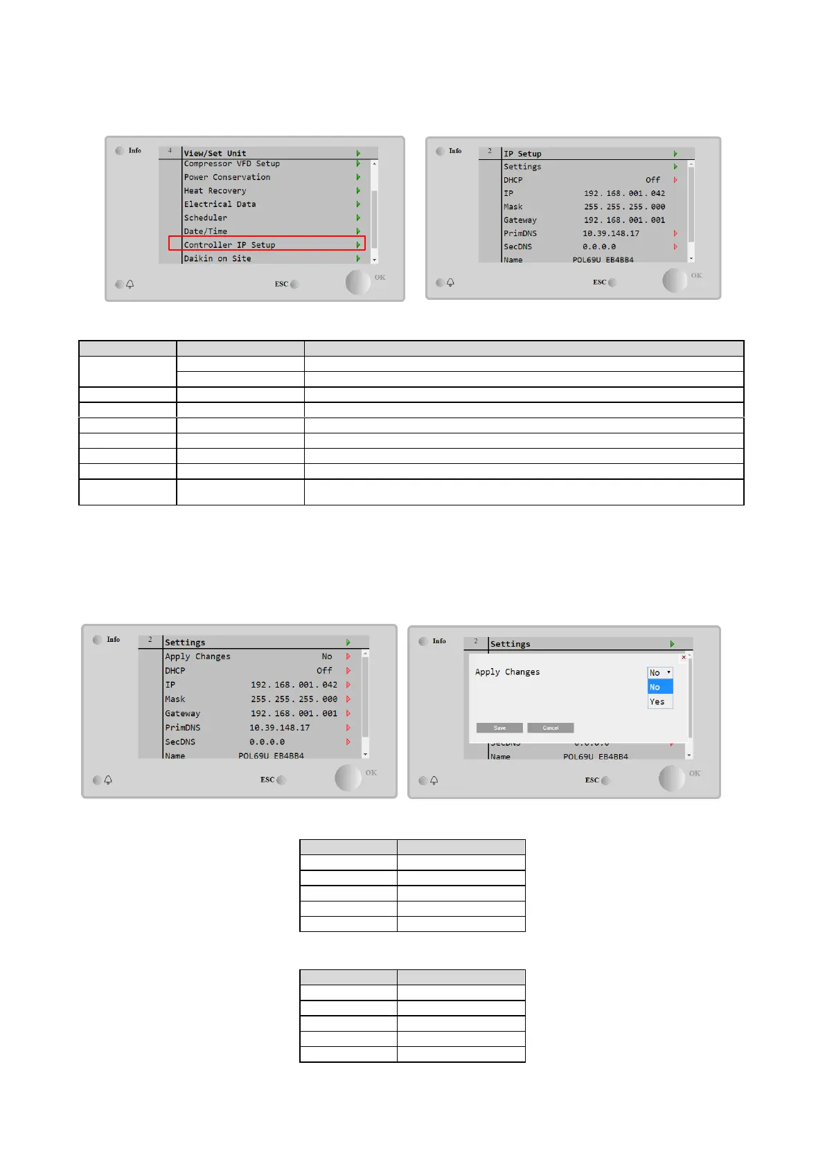 • modify the IP, Mask, Gateway, PrimDNS and ScndDNS addresses, if needed, taking care of the current