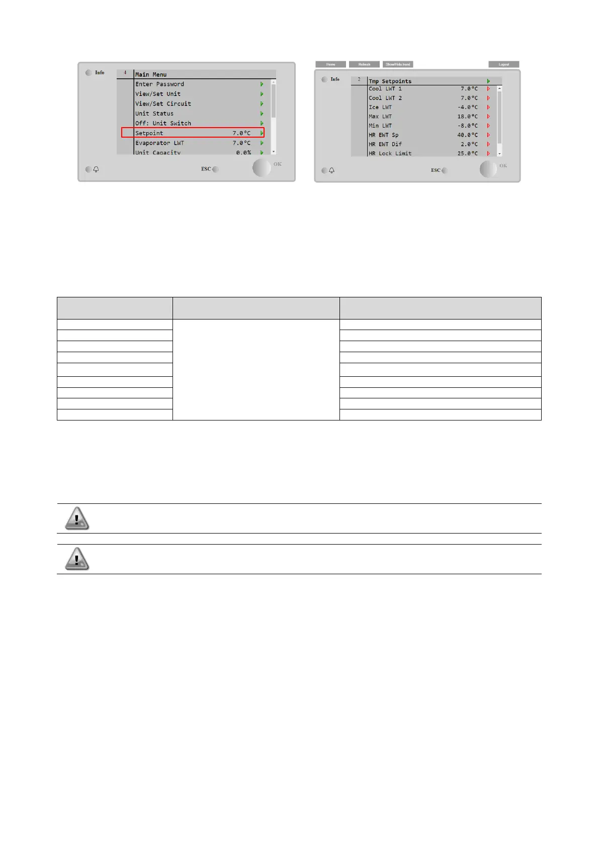 As first step the primary and secondary setpoints need to be defined. From main menu, with user password, press on
