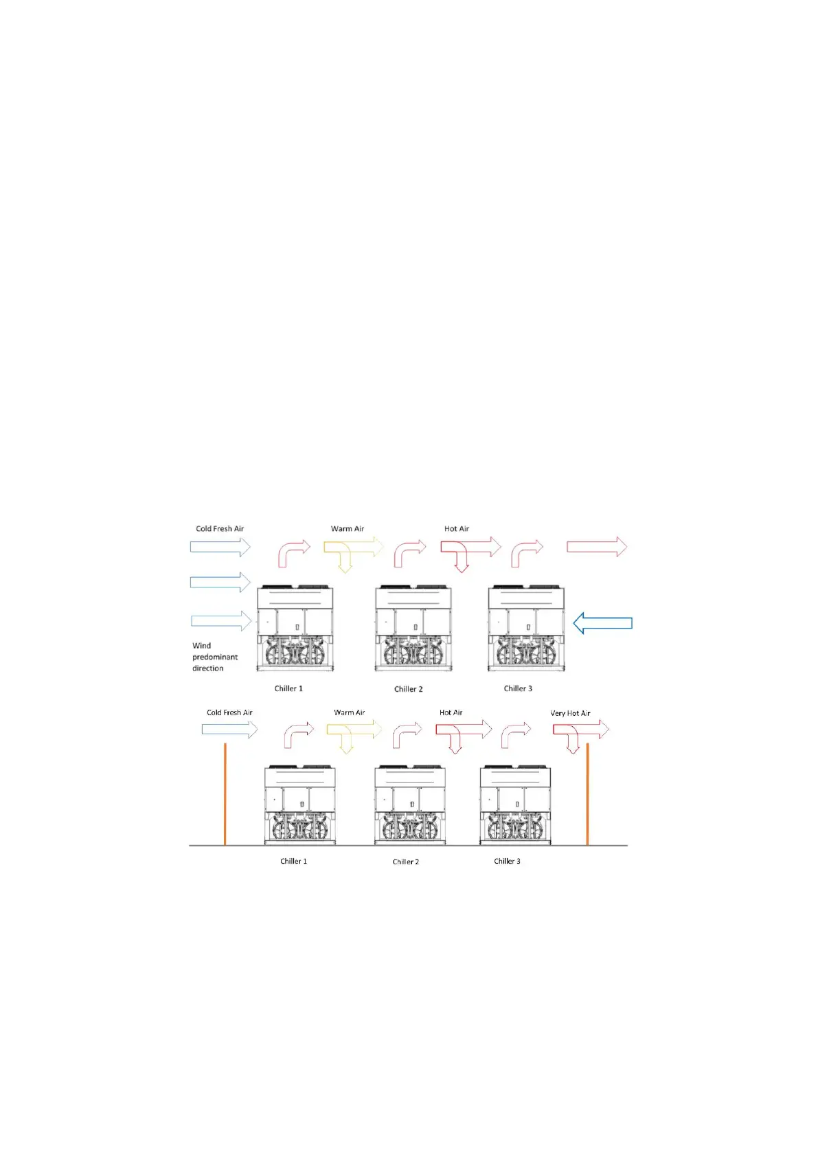 In order to avoid the hot air recirculation due to dominant winds, the installation where all chillers are aligned to the