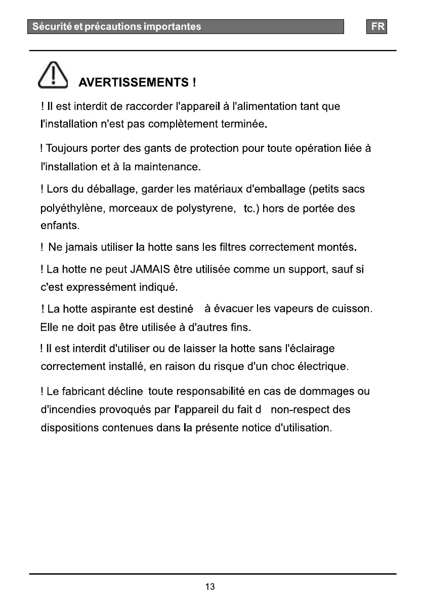 ! II est Interdit d'utiliser ou de laisser la hotte sans l'éclairage correctement installé, en raison