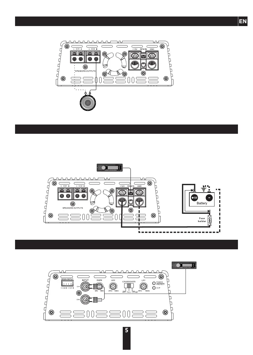 Step 1. Connect one end of the power cable from (+) terminal of the battery and the second end to the amplifier terminal