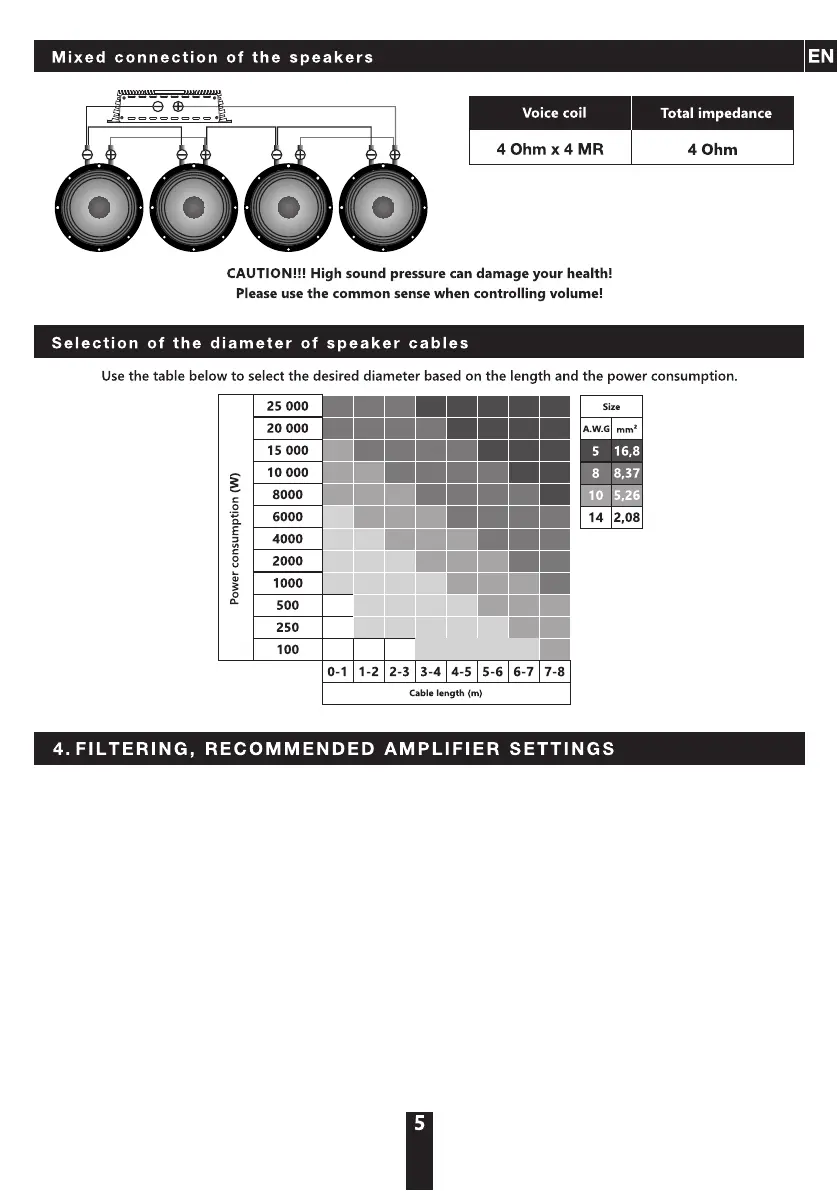 voice coil damage. Recommended settings of the amplifier and HU: Volume of HU should not exceed 80%. The amplifier