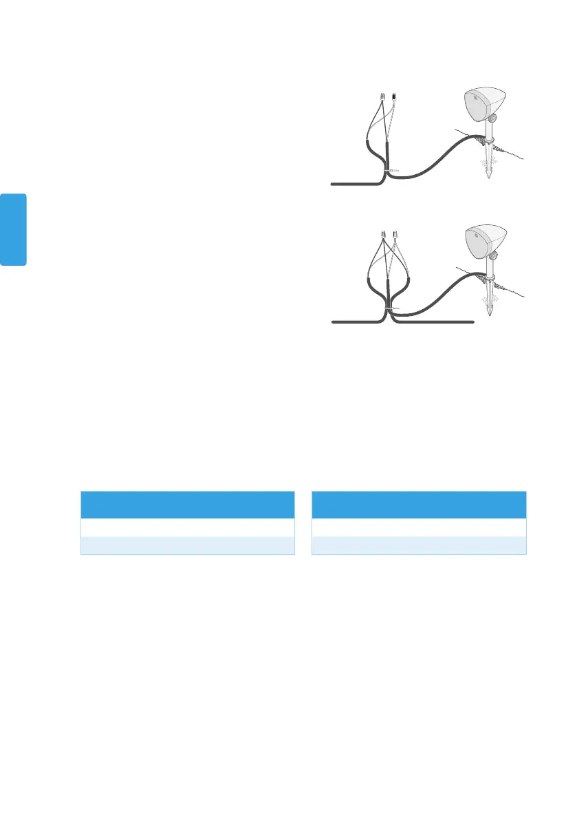 8. Corte los dos cables correctos para el altavoz izquierdo o derecho (consulte las tablas a continuación) y pele
