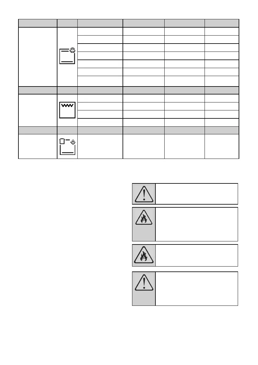 Oven mode Icon Food item Shelf position Temp setting (ºC) Duration (min)