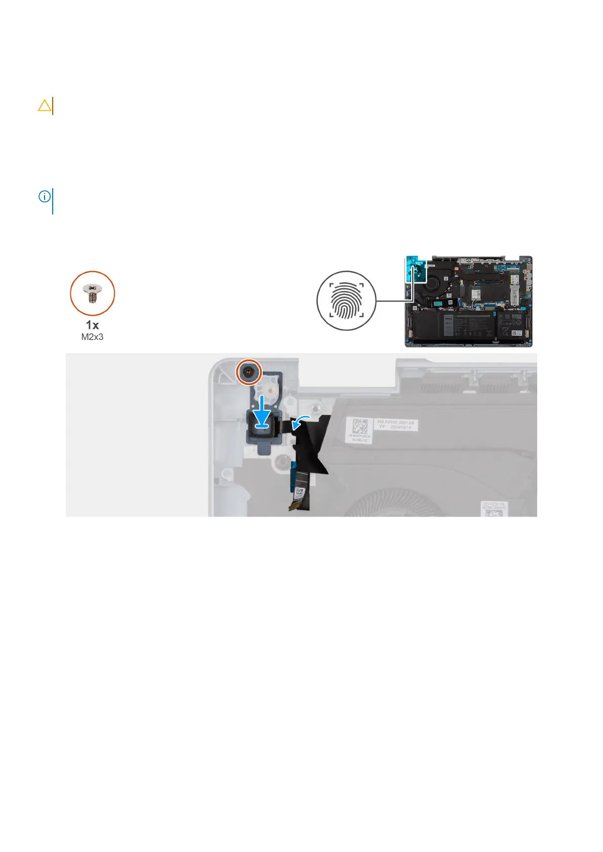 3. Replace the screw (M2x3) that secures the power button with fingerprint reader to the palm-rest and keyboard assembly.