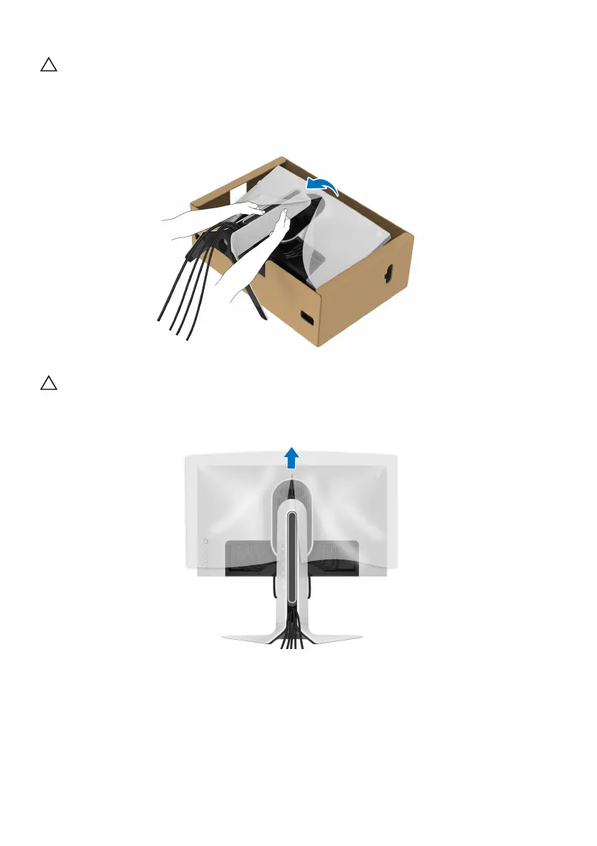 11. Hold the stand riser and lift the monitor carefully, then place it on a flat