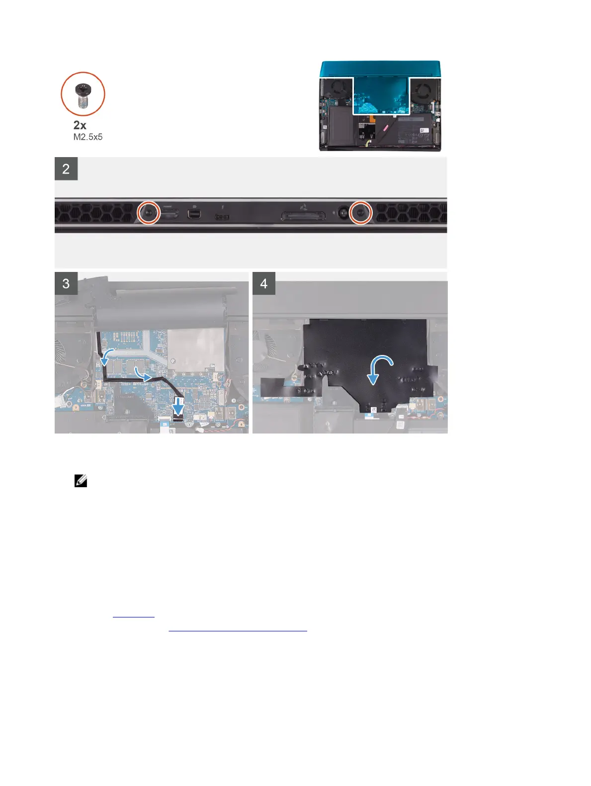 2 Replace the two screws (M2.5x5) that secure the rear I/O-cover to the palm-rest assembly.