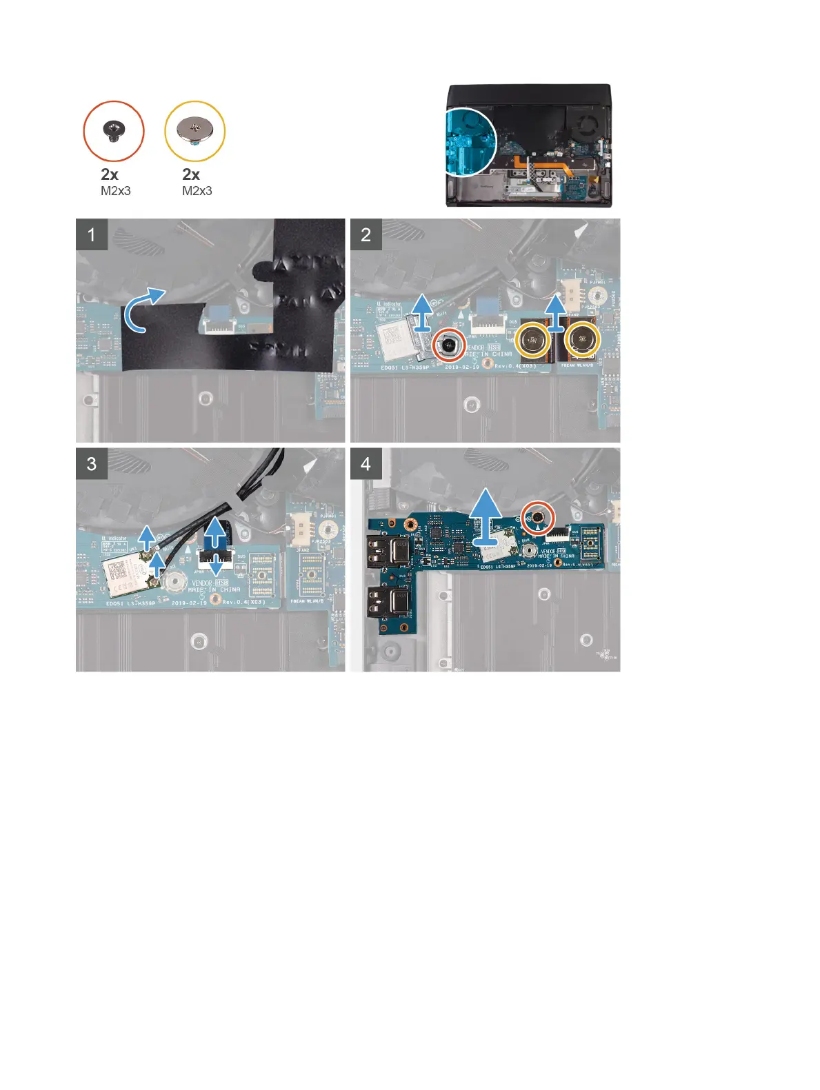 4 Remove the two screws (M2x3) that secure the left I/O-board cable connecting the left I/O-board and the system board.