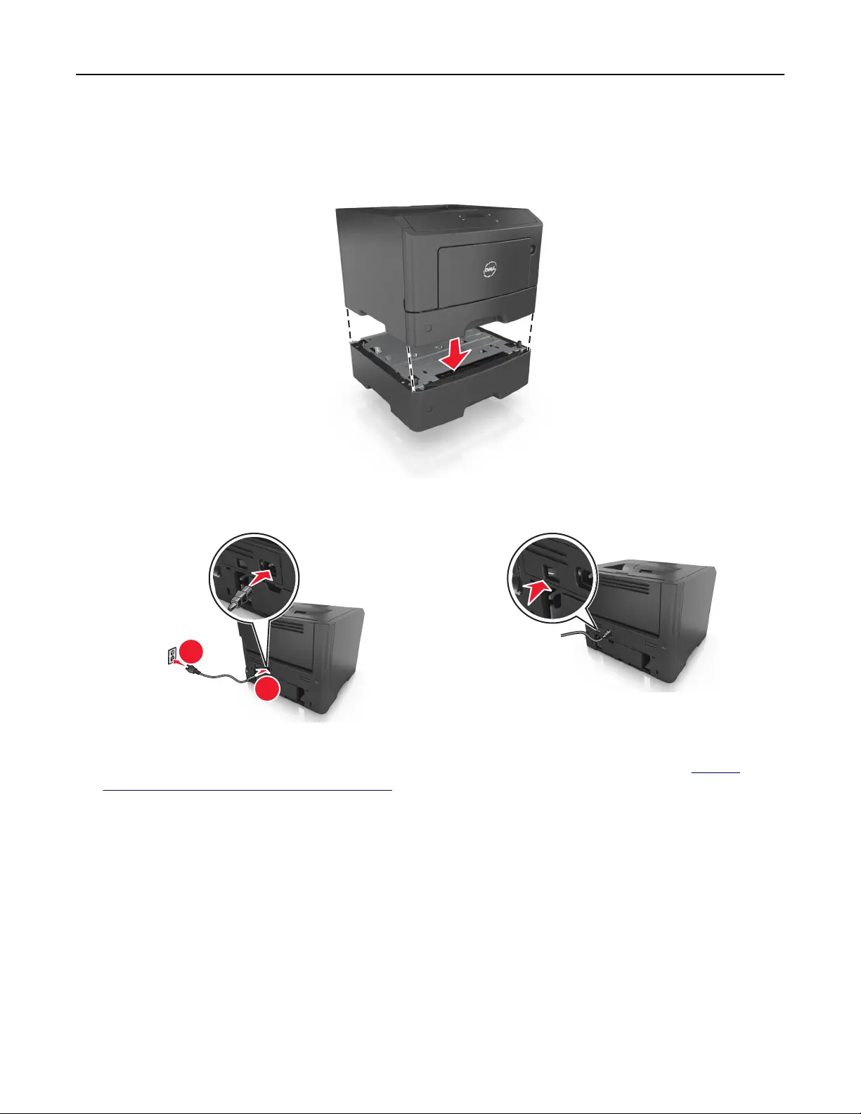 8 Connect the power cord to the printer, then to a properly grounded electrical outlet, and then turn on the printer.