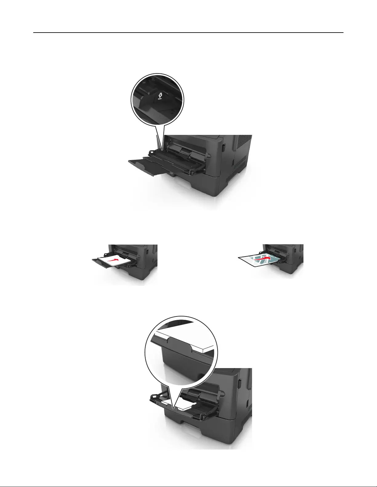 • Load paper, transparencies, and card stock with the recommended printable side faceup and the top edge