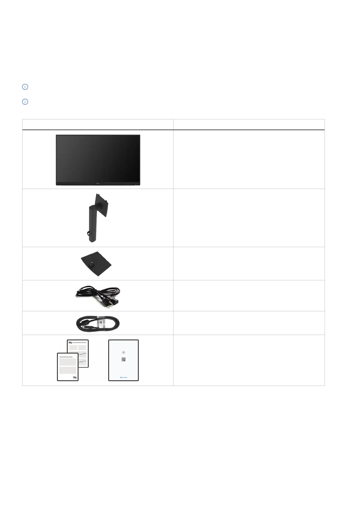 The following table provides the list of components that are shipped with your monitor. If any component is missing, contact Dell. For