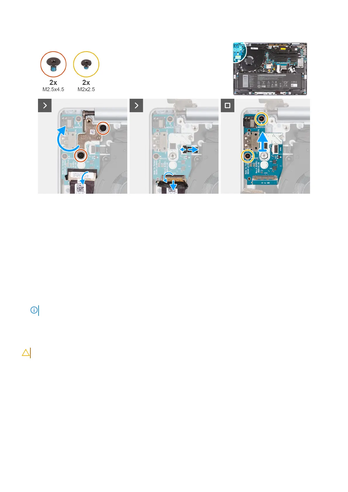 6. Verwijder de twee schroeven (M2x2.5) waarmee de I/O-kaart op de polssteun- en toetsenbordeenheid wordt bevestigd.