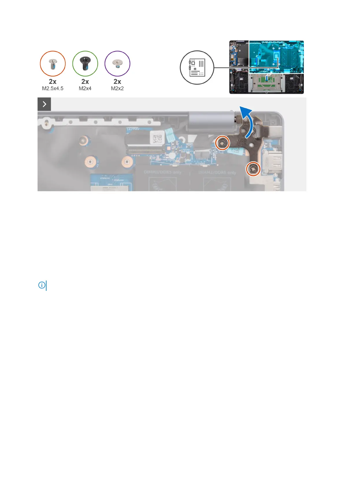 1. Remove the two screws (M2.5x4.5) that secure the right display hinge to the system board and the palm-rest and keyboard