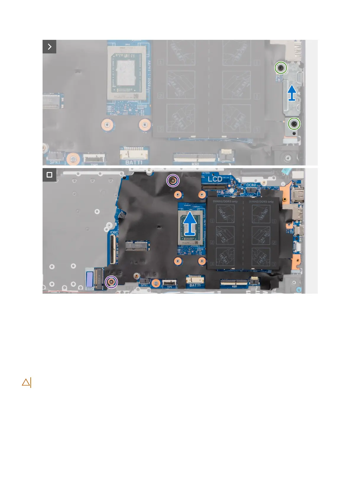 6. Carefully lift and remove the system board at angle, from the palm-rest and keyboard assembly, to clear the ports from the