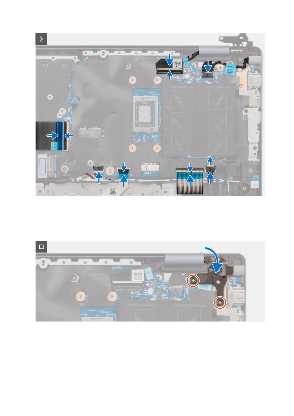9. Replace the two screws (M2.5x4.5) to secure the right display hinge to the system board and the palm-rest and keyboard