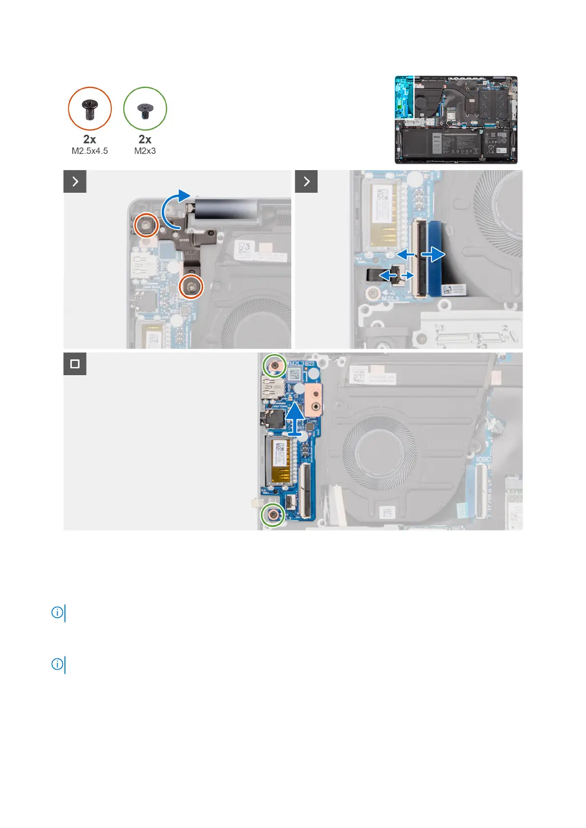 1. Remove the two screws (M2.5x4) that secure the left display hinge to the I/O board and the palm-rest and keyboard