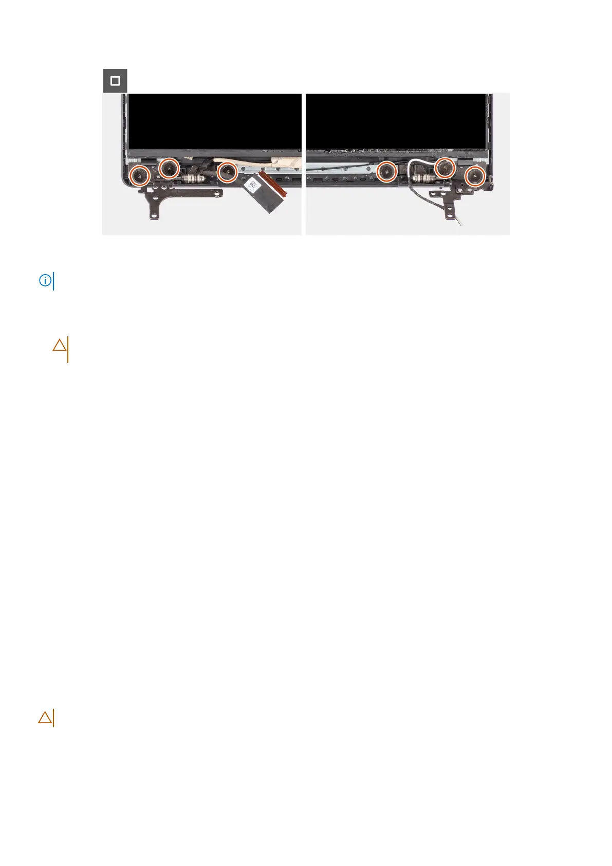 8. Replace the six screws (M2.5x2.5) to secure the display hinges to the display back-cover and antenna assembly.