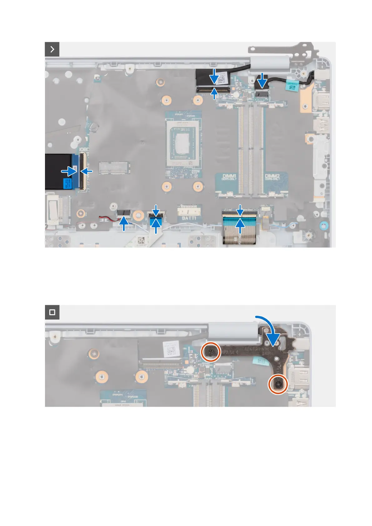 9. Replace the two screws (M2.5x4) to secure the right display hinge to the system board and the palm-rest and keyboard