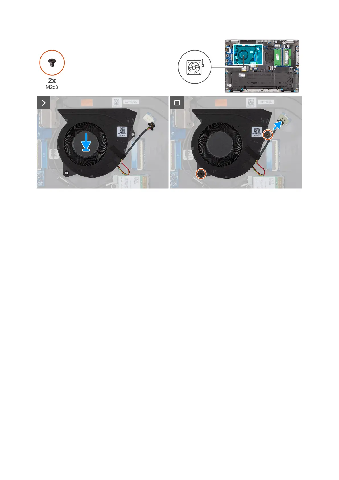 2. Replace the two screws (M2x3) that secures the fan to the system board.